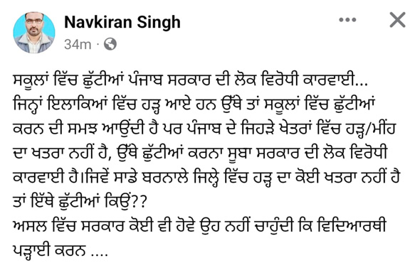 ਚੰਡੀਗੜ੍ਹ,23 ਅਗਸਤ-ਪੰਜਾਬ ਸਰਕਾਰ ਵੱਲੋਂ ਹੜ੍ਹਾਂ ਦੇ ਮੱਦੇਨਜ਼ਰ ਸੁਰੱਖਿਆ ਵਜੋਂ ਸੂਬੇ ਦੇ ਸਾਰੇ ਸਰਕਾਰੀ ਅਤੇ ਪ੍ਰਾਈਵੇਟ ਸਕੂਲਾਂ ਵਿੱਚ 26 ਅਗਸਤ ਤੱਕ ਤੁਰੰਤ ਛੁੱਟੀਆਂ ਦੇ ਫੈਸਲੇ ਨੂੰ ਹੈਰਾਨੀਜਨਕ ਤਰੀਕੇ ਨਾਲ ਵੇਖਿਆ ਜਾ ਰਿਹਾ ਹੈ। ਸਕੂਲਾਂ ਵਿੱਚ ਛੁੱਟੀਆਂ ਕਰਨ ਦੇ ਐਲਾਨ ਤੋਂ ਬਾਅਦ ਸੋਸ਼ਲ ਮੀਡੀਆ ‘ਤੇ ਕੁਝ ਇਸ ਤਰ੍ਹਾਂ ਦੀਆਂ ਟਿੱਪਣੀਆਂ ਵੀ ਹੋ ਰਹੀਆਂ ਹਨ ਕਿ “ਆਖ਼ਰ ! ਸਰਕਾਰ ਨੂੰ ਅਜਿਹੀਆਂ ਸਲਾਹਾਂ ਦੇ ਕੌਣ ਰਿਹਾ ਹੈ” । ਸੂਬੇ ਦੇ ਸਿੱਖਿਆ ਮੰਤਰੀ ਹਰਜੋਤ ਸਿੰਘ ਬੈਂਸ ਨੇ ਟਵੀਟ ਕੀਤਾ ਕਿ ਸੁਰੱਖਿਆ ਦੇ ਮੱਦੇਨਜ਼ਰ ਛੁੱਟੀਆਂ ਕੀਤੀਆਂ ਜਾ ਰਹੀਆਂ ਹਨ, ਜਦ ਕਿ ਜ਼ਮੀਨੀ ਪੱਧਰ ‘ਤੇ ਸੱਚਾਈ ਇਹੋ ਹੈ ਕਿ ਸੂਬੇ ਦੇ ਮਾਲਵਾ ਖੇਤਰ ਵਿੱਚ ਹੜਾਂ ਦਾ ਕੋਈ ਖ਼ਤਰਾ ਹੀ ਨਹੀਂ ਹੈ। ਸਰਕਾਰ ਦੇ ਫ਼ੈਸਲੇ ‘ਤੇ ਟਿੱਪਣੀ ਕਰਦੇ ਹੋਏ ਆਪਣਾ ਨਾਮ ਗੁਪਤ ਰੱਖਣ ਦੀ ਸ਼ਰਤ ‘ਤੇ ਇੱਕ ਸਰਕਾਰੀ ਅਧਿਆਪਕ ਨੇ ਕਿਹਾ ਕਿ “ਪੜ੍ਹਾਈ ਦੇ ਮਾਮਲੇ ‘ਚ ਜਦੋਂ ਤੱਕ ਬੱਚਿਆਂ ਦੀ ਗੱਡੀ ਲਾਈਨ ‘ਤੇ ਚੜ੍ਹਦੀ ਹੈ ਉਦੋਂ ਨੂੰ ਸਰਕਾਰ ਅਜਿਹਾ ਕੋਈ ਬੇਤੁਕਾ ਐਲਾਨ ਕਰ ਦਿੰਦੀ ਹੈ”। ਸਰਕਾਰ ਦੇ ਇਸ ਫ਼ੈਸਲੇ ਨੂੰ ਹੜਾਂ ਦੇ ਮਾਮਲੇ ‘ਚ ਆਪਾ-ਵਿਰੋਧੀ ਵੀ ਮੰਨਿਆ ਜਾ ਰਿਹਾ ਹੈ ਕਿਉਂਕਿ ਇੱਕ ਪਾਸੇ ਤਾਂ ਸਰਕਾਰ ਇਹ ਦਾਅਵੇ ਕਰਦੀ ਹੈ ਕਿ ਸਥਿਤੀ ਕੰਟਰੋਲ ਅਧੀਨ ਹੈ। ਹੜਾਂ ਤੋਂ ਖ਼ਤਰੇ ਦੇ ਮੱਦੇਨਜ਼ਰ ਕੀਤੀਆਂ ਛੁੱਟੀਆਂ ਸਬੰਧੀ ਆਮ ਲੋਕ ਆਖ ਰਹੇ ਹਨ ਕਿ “ਸਰਕਾਰ ਨੇ ਬਿਨਾਂ ਪਾਣੀ ਤੋਂ ਮੌਜੇ ਲਾਹੇ ਹੋਏ ਹਨ”। ਲੋਕਾਂ ਦਾ ਇਹ ਵੀ ਕਹਿਣਾ ਹੈ ਕਿ ਜਿਹੜੇ ਜ਼ਿਲ੍ਹਿਆਂ ਵਿੱਚ ਸਥਿਤੀ ਕੰਟਰੋਲ ਤੋਂ ਬਾਹਰ ਹੈ ਉੱਥੇ ਛੁੱਟੀਆਂ ਕਰਨ ਦੀ ਤੁਕ ਬਣਦੀ ਹੈ ਪ੍ਰੰਤੂ ਜਿਹੜੇ ਜ਼ਿਲ੍ਹਿਆਂ ਵਿੱਚ ਲੋਕ ਮੀਂਹ ਪਵਾਉਣ ਲਈ ਧਾਰਮਿਕ ਅਸਥਾਨਾਂ ‘ਤੇ ਯੱਗ ਕਰਨ ਦੀਆਂ ਅਰਦਾਸਾਂ ਕਰ ਰਹੇ ਹਨ ਉਥੇ ਛੁੱਟੀਆਂ ਦਾ ਕੋਈ ਮਤਲਬ ਨਹੀਂ ਬਣਦਾ । ਜ਼ਿਕਰਯੋਗ ਹੈ ਕਿ ਮਾਲਵੇ ਦੇ ਵੱਡੇ ਖੇਤਰ ਵਿੱਚ ਭਾਦੋਂ ਦੀ ਗਰਮੀ ਅਤੇ ਹੁੰਮਸ ਨੇ “ਵੱਟ” ਕੱਢੇ ਹੋਏ ਹਨ ਅਤੇ ਲੋਕ ਮੀਹ ਪੈਣ ਦੀਆਂ ਅਰਦਾਸਾਂ ਕਰ ਰਹੇ ਹਨ । ਸਰਕਾਰ ਨੇ ਪੂਰੇ ਸੂਬੇ ਦੀ ਫੀਡਬੈਕ ਲੈਣ ਤੋਂ ਬਿਨਾਂ ਹੀ ਇਹ ਵੱਡਾ ਫੈਸਲਾ ਕਰ ਦਿੱਤਾ ਹੈ। ਇੱਥੇ ਇਹ ਵੀ ਦੱਸਣਯੋਗ ਹੈ ਕਿ ਵੋਟਰ ਸੂਚੀਆਂ ਦੀ ਸੁਧਾਈ ਕਾਰਨ ਬਤੌਰ BLO ਡਿਊਟੀ ਕਾਰਨ ਬਹੁਤੇ ਅਧਿਆਪਕ ਇੱਕ ਮਹੀਨੇ ਤੋਂ ਸਕੂਲਾਂ ਤੋਂ ਬਾਹਰ ਸਨ, ਹੁਣ ਜਦੋਂ ਇਹ ਅਧਿਆਪਕ ਸਕੂਲਾਂ ‘ਚ ਵਾਪਿਸ ਪਰਤੇ ਹਨ ਤਾਂ ਸਰਕਾਰ ਨੇ ਛੁੱਟੀਆਂ ਕਰ ਦਿੱਤੀਆਂ ।