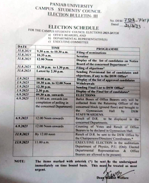 ਚੰਡੀਗੜ੍ਹ,26 ਅਗਸਤ-ਪੰਜਾਬ ਯੂਨੀਵਰਸਿਟੀ ਅਤੇ ਚੰਡੀਗੜ੍ਹ ਦੇ 11 ਕਾਲਜਾਂ ਵਿੱਚ ਵਿਦਿਆਰਥੀ ਯੂਨੀਅਨਾਂ ਦੀਆਂ ਚੋਣਾਂ 6 ਸਤੰਬਰ ਨੂੰ ਹੋਣਗੀਆਂ । ਵਿਦਿਆਰਥੀ ਚੋਣਾਂ ਦਾ ਸਾਰਾ ਸ਼ਡਿਊਲ ਜਾਰੀ ਕਰ ਦਿੱਤਾ ਗਿਆ ਹੈ, ਜਿਸ ਅਨੁਸਾਰ 30 ਅਗਸਤ ਨੂੰ ਨੋਟਿਸ ਦਿੱਤੇ ਜਾਣਗੇ ਅਤੇ 31 ਅਗਸਤ ਨੂੰ ਨਾਮਜ਼ਦਗੀਆਂ ਭਰੀਆਂ ਜਾਣਗੀਆਂ । ਨਾਮਜ਼ਦਗੀਆਂ ਭਰਨ ਵਾਲੇ ਵਿਦਿਆਰਥੀ 1 ਸਤੰਬਰ ਨੂੰ ਆਪਣੇ ਨਾਮ ਵਾਪਸ ਲੈ ਸਕਣਗੇ। ਇਨ੍ਹਾਂ ਚੋਣਾਂ ਲਈ ਵੱਖ-ਵੱਖ ਵਿਦਿਆਰਥੀ ਜਥੇਬੰਦੀਆਂ ਕਾਫੀ ਸਰਗਰਮੀ ਨਾਲ ਪ੍ਰਚਾਰ ਕਰਦੀਆਂ ਹਨ ।