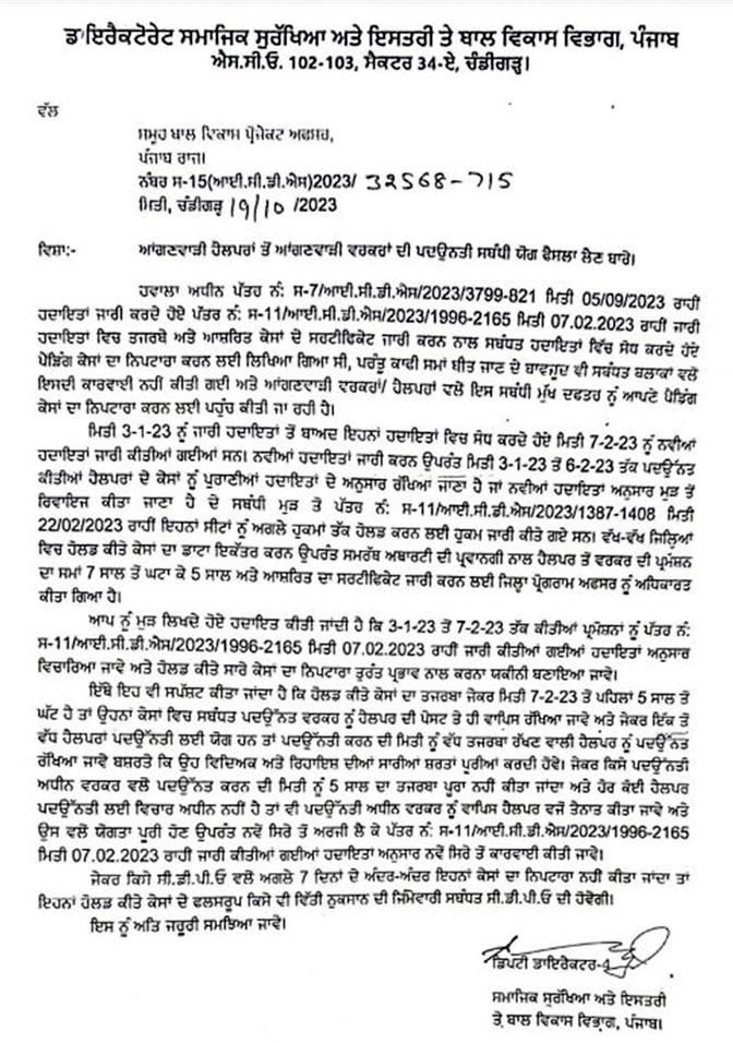 ਚੰਡੀਗੜ੍ਹ,21 ਅਕਤੂਬਰ (Gee98 news service)-ਪੰਜਾਬ ਦੇ ਸਮਾਜਿਕ ਸੁਰੱਖਿਆ ਅਤੇ ਇਸਤਰੀ ਤੇ ਬਾਲ ਵਿਕਾਸ ਵਿਭਾਗ ਵੱਲੋਂ ਹੈਲਪਰਾਂ ਤੋਂ ਵਰਕਰਾਂ ਦੀ ਤਰੱਕੀ ਦੇ ਮਾਮਲੇ ‘ਚ ਜਾਰੀ ਕੀਤੇ ਇੱਕ ਪੱਤਰ ਨੇ ਕਰੀਬ 10 ਮਹੀਨੇ ਪਹਿਲਾਂ ਹੈਲਪਰਾਂ ਤੋਂ ਵਰਕਰ ਪ੍ਰਮੋਟ ਹੋਈਆਂ ਆਂਗਨਵਾੜੀ ਵਰਕਰਾਂ ਦੀ ਪ੍ਰਮੋਸ਼ਨ ‘ਤੇ ਤਲਵਾਰ ਲਟਕਾ ਦਿੱਤੀ ਹੈ। ਵਿਭਾਗ ਦੀਆਂ ਨਵੀਆਂ ਹਦਾਇਤਾਂ ਅਨੁਸਾਰ ਜਿਹੜੀਆਂ ਹੈਲਪਰਾਂ ਤੋਂ ਵਰਕਰ ਪ੍ਰਮੋਟ ਹੋਈਆਂ ਆਂਗਨਵਾੜੀ ਵਰਕਰਾਂ ਨਵੇਂ ਨਿਯਮਾਂ ਦੇ ਘੇਰੇ ਵਿੱਚ ਨਹੀਂ ਆਉਂਦੀਆਂ ਉਹਨਾਂ ਨੂੰ ਹੁਣ ਵਾਪਸ ਹੈਲਪਰ ਦੇ ਅਹੁਦੇ ‘ਤੇ ਹੀ ਕੰਮ ਕਰਨਾ ਪਵੇਗਾ। ਜ਼ਿਕਰਯੋਗ ਹੈ ਕਿ ਪਹਿਲਾਂ 3 ਜਨਵਰੀ 2023 ਨੂੰ ਜਾਰੀ ਹਦਾਇਤਾਂ ਅਨੁਸਾਰ ਤਰੱਕੀਆਂ ਦਿੱਤੀਆਂ ਗਈਆਂ ਪ੍ਰੰਤੂ ਫਿਰ 7 ਫਰਵਰੀ 2023 ਨੂੰ ਨਵੀਆਂ ਹਦਾਇਤਾਂ ਜਾਰੀ ਕੀਤੀਆਂ ਗਈਆਂ। ਇਸ ਦੌਰਾਨ 3 ਜਨਵਰੀ ਤੋਂ ਲੈ ਕੇ 6 ਫਰਵਰੀ ਤੱਕ ਤਰੱਕੀਆਂ ਦੇ ਕੇਸਾਂ ਨੂੰ ਹੋਲਡ ਕੀਤਾ ਅਤੇ ਫੇਰ ਹੁਕਮ ਜਾਰੀ ਕੀਤੇ ਗਏ ਕਿ 7 ਫਰਵਰੀ 2023 ਨੂੰ ਜਾਰੀ ਨਵੀਆਂ ਹਦਾਇਤਾਂ ਅਨੁਸਾਰ ਹੈਲਪਰਾਂ ਤੋਂ ਵਰਕਰਾਂ ਦੀ ਪਦਉੱਨਤੀ ਦੇ ਕੇਸਾਂ ਨੂੰ ਵਿਚਾਰਿਆ ਜਾਵੇ । ਹੁਣ ਵਿਭਾਗ ਦੇ ਡਿਪਟੀ ਡਾਇਰੈਕਟਰ ਵੱਲੋਂ 19 ਅਕਤੂਬਰ ਨੂੰ ਜਾਰੀ ਕੀਤੇ ਪੱਤਰ ਮੁਤਾਬਕ ਇਹਨਾਂ ਹੋਲਡ ਕੀਤੇ ਕੇਸਾਂ ਦਾ ਤਜਰਬਾ ਜੇਕਰ ਮਿਤੀ 7 ਫਰਵਰੀ 23 ਤੋਂ ਪਹਿਲਾਂ ਪੰਜ ਸਾਲ ਤੋਂ ਘੱਟ ਹੈ ਤਾਂ ਉਹਨਾਂ ਕੇਸਾਂ ਵਿੱਚ ਸੰਬੰਧਤ ਪਦਉਨਤ ਵਰਕਰ ਨੂੰ ਹੈਲਪਰ ਦੀ ਪੋਸਟ ‘ਤੇ ਹੀ ਵਾਪਸ ਰੱਖਿਆ ਜਾਵੇਗਾ । ਜੇਕਰ ਇੱਕ ਤੋਂ ਵੱਧ ਹੈਲਪਰਾਂ ਪਦਉਨਤੀ ਲਈ ਯੋਗ ਹਨ ਤਾਂ ਪਦਉਨਤੀ ਕਰਨ ਦੀ ਮਿਤੀ ਨੂੰ ਵੱਧ ਤਜਰਬਾ ਰੱਖਣ ਵਾਲੀ ਹੈਲਪਰ ਨੂੰ ਪਦਉਨਤ ਰੱਖਿਆ ਜਾਵੇਗਾ ਬਸ਼ਰਤੇ ਕੇ ਉਹ ਵਿਦਿਕ ਅਤੇ ਰਿਹਾਇਸ਼ ਦੀਆਂ ਸਾਰੀਆਂ ਸ਼ਰਤਾਂ ਪੂਰੀਆਂ ਕਰਦੀ ਹੋਵੇ। ਜੇਕਰ ਕਿਸੇ ਪਦਉਨਤੀ ਅਧੀਨ ਵਰਕਰ ਵੱਲੋਂ ਪਦਉਨਤ ਕਰਨ ਦੀ ਮਿਤੀ ਨੂੰ ਪੰਜ ਸਾਲ ਦਾ ਤਜਰਬਾ ਪੂਰਾ ਨਹੀਂ ਕੀਤਾ ਜਾਂਦਾ ਤੇ ਹੋਰ ਕੋਈ ਹੈਲਪਰ ਪਦਉਨਤੀ ਲਈ ਵਿਚਾਰ ਅਧੀਨ ਨਹੀਂ ਹੈ ਤਾਂ ਵੀ ਪਦਉਨਤੀ ਅਧੀਨ ਵਰਕਰ ਨੂੰ ਵਾਪਸ ਹੈਲਪਰ ਵਜੋਂ ਹੀ ਕੰਮ ਕਰਨਾ ਪਵੇਗਾ ਅਤੇ ਉਸ ਵੱਲੋਂ ਯੋਗਤਾ ਪੂਰੀ ਹੋਣ ਉਪਰੰਤ ਨਵੇਂ ਸਿਰੇ ਤੋਂ ਅਰਜ਼ੀ ਲੈ ਕੇ 7 ਫਰਵਰੀ 2023 ਨੂੰ ਜਾਰੀ ਹਦਾਇਤਾਂ ਅਨੁਸਾਰ ਨਵੇਂ ਸਿਰੇ ਤੋਂ ਕਾਰਵਾਈ ਕੀਤੀ ਜਾਵੇ। ਇਹਨਾਂ ਨਵੇਂ ਨਿਯਮਾਂ ਤਹਿਤ ਬਹੁਤ ਸਾਰੀਆਂ ਅਜਿਹੀਆਂ ਪਦਉਨਤ ਆਂਗਨਵਾੜੀ ਵਰਕਰਾਂ ਨੂੰ ਹੁਣ ਦੁਬਾਰਾ ਫੇਰ ਹੈਲਪਰ ਦੀ ਪੋਸਟ ‘ਤੇ ਹੀ ਕੰਮ ਕਰਨਾ ਪਵੇਗਾ । ਕਰੀਬ 10 ਮਹੀਨੇ ਬਤੌਰ ਆਂਗਨਵਾੜੀ ਵਰਕਰ ਨੌਕਰੀ ਕਰਨ ਤੋਂ ਬਾਅਦ ਦੁਬਾਰਾ ਫਿਰ ਹੈਲਪਰ ਦੀ ਪੋਸਟ ‘ਤੇ ਕੰਮ ਕਰਨ ਕਰਕੇ ਅਜਿਹੀਆਂ ਵਰਕਰਾਂ ਨੂੰ ਨਮੋਸ਼ੀ ਦਾ ਸਾਹਮਣਾ ਵੀ ਕਰਨਾ ਪਵੇਗਾ । ਵਿਭਾਗ ਦੇ ਡਿਪਟੀ ਡਾਇਰੈਕਟਰ ਵੱਲੋਂ ਸੂਬੇ ਦੇ ਸਾਰੇ ਸੀਡੀਪੀਓਜ਼ ਨੂੰ 19 ਅਕਤੂਬਰ ਦੇ ਪੱਤਰ ‘ਤੇ ਨਵੀਆਂ ਹਦਾਇਤਾਂ ਅਨੁਸਾਰ ਕਾਰਵਾਈ ਕਰਨ ਲਈ ਸਖ਼ਤ ਹੁਕਮ ਜਾਰੀ ਕਰਕੇ ਕਿਹਾ ਗਿਆ ਹੈ ਕਿ ਜਿਹੜੀਆਂ ਪੳਉੱਨਤ ਹੋਈਆਂ ਆਂਗਨਵਾੜੀ ਵਰਕਰਾਂ ਨਵੇਂ ਨਿਯਮਾਂ ਦੀ ਪਾਲਣਾ ਨਹੀਂ ਕਰਦੀਆਂ ਉਹਨਾਂ ਨੂੰ ਇੱਕ ਹਫ਼ਤੇ ਦੇ ਵਿੱਚ-ਵਿੱਚ ਵਾਪਸ ਹੈਲਪਰ ਦੀ ਪੋਸਟ ‘ਤੇ ਲਿਆਂਦਾ ਜਾਵੇ ।