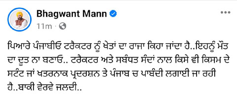 ਚੰਡੀਗੜ੍ਹ,30 ਅਕਤੂਬਰ-ਕਬੱਡੀ ਦੇ ਟੂਰਨਾਮੈਂਟ ‘ਤੇ ਟਰੈਕਟਰ ਨਾਲ ਸਟੰਟ ਕਰਦੇ ਸਮੇਂ ਇੱਕ ਨੌਜਵਾਨ ਦੀ ਮੌਤ ਹੋਣ ਤੋਂ ਬਾਅਦ ਪੰਜਾਬ ਸਰਕਾਰ ਨੇ ਟਰੈਕਟਰ ਸਟੰਟ ‘ਤੇ ਮੁਕੰਮਲ ਪਾਬੰਦੀ ਦੇ ਹੁਕਮ ਜਾਰੀ ਕੀਤੇ ਹਨ । ਇਸ ਸਬੰਧੀ ਮੁੱਖ ਮੰਤਰੀ ਭਗਵੰਤ ਮਾਨ ਨੇ ਕਿਹਾ ਕਿ ਟਰੈਕਟਰ ਨੂੰ “ਖੇਤਾਂ ਦਾ ਰਾਜਾ” ਹੀ ਰਹਿਣ ਦਿੱਤਾ ਜਾਵੇ । ਮੁੱਖ ਮੰਤਰੀ ਨੇ ਕਿਹਾ ਕਿ ਇਸ ਤਰ੍ਹਾਂ ਦੇ ਸਟੰਟ ਕਾਰਨ ‘ਤੇ ਪਾਬੰਦੀ ਲਗਾਈ ਜਾਂਦੀ ਹੈ ਜਿਸ ਸਬੰਧੀ ਹੁਕਮ ਬਾਅਦ ਵਿੱਚ ਜਾਰੀ ਕੀਤੇ ਜਾਣਗੇ।