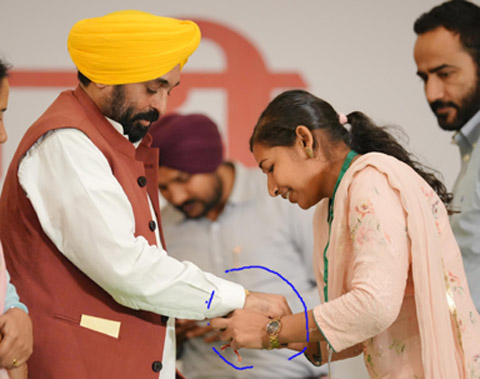 ਫੋਟੋ ਕੈਪਸ਼ਨ-ਸਮਾਗਮ ਵਿੱਚ ਪੁੱਜੀ ਇੱਕ ਕੁੜੀ ਵੱਲੋਂ ਮੁੱਖ ਮੰਤਰੀ ਦੇ ਰੱਖੜੀ ਬੰਨੇ ਜਾਣ ਦੀ ਤਸਵੀਰ