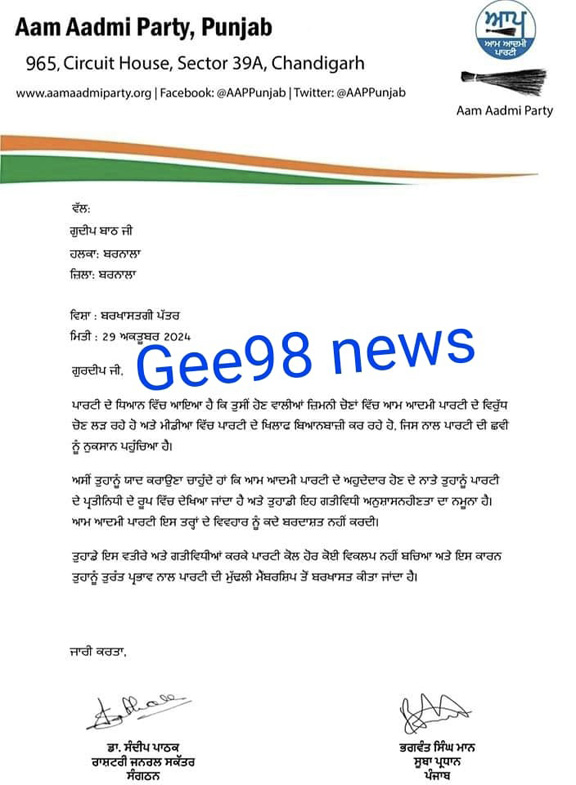 ਬਾਠ ਦੇ ਖ਼ਿਲਾਫ਼ AAP ਦੀ ਵੱਡੀ ਕਾਰਵਾਈ…ਪੜੋ ਪੱਤਰ ਦੀ ਕਾਪੀ