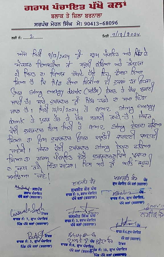 ਪੱਖੋ ਕਲਾਂ ਦੀ ਪੰਚਾਇਤ ਨੇ ਸਟਿੰਗ ਐਨਰਜੀ ਡਰਿੰਕ ‘ਤੇ ਲਗਾਈ ਪਾਬੰਦੀ