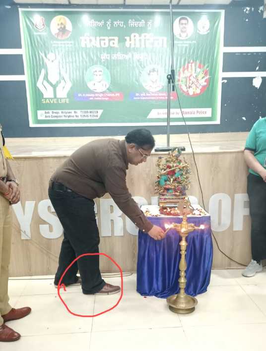 -ਬਰਨਾਲਾ ਜ਼ਿਲ੍ਹੇ ਦੇ ਇੱਕ ਵੱਡੇ ਵਿਦਿਅਕ ਗਰੁੱਪ ਦੇ ਮੁਖੀ ਵੱਲੋਂ ਆਪਣੀ ਵਿਦਿਅਕ ਸੰਸਥਾ ਦੇ ਕੰਪਲੈਕਸ ਅੰਦਰ ਇੱਕ ਸਮਾਗਮ ਦੌਰਾਨ ਵੱਡੀ ਧਾਰਮਿਕ ਕੁਰਹਿਤ ਕਰਨ ਦਾ ਮਾਮਲਾ ਸਾਹਮਣੇ ਆਇਆ ਹੈ। ਪ੍ਰਾਪਤ ਜਾਣਕਾਰੀ ਅਨੁਸਾਰ ਜ਼ਿਲ੍ਹੇ ਦੀ ਵੱਡੀ ਨਾਮਵਰ ਵਿਦਿਅਕ ਸੰਸਥਾ YS ਗਰੁੱਪ ਦੇ ਬਠਿੰਡਾ ਰੋਡ ‘ਤੇ ਸਥਿਤ ਕਾਲਜ ਵਿੱਚ ਪਿਛਲੇ ਦਿਨੀਂ ਪੰਜਾਬ ਪੁਲਿਸ ਵੱਲੋਂ ਯੁੱਧ ਨਸ਼ਿਆਂ ਵਿਰੁੱਧ ਮੁਹਿੰਮ ਤਹਿਤ ਇੱਕ ਸੰਪਰਕ ਮੀਟਿੰਗ ਦਾ ਆਯੋਜਨ ਕੀਤਾ ਗਿਆ ਜਿੱਥੇ ਪੰਜਾਬ ਪੁਲਿਸ ਦੇ ਉੱਚ ਅਧਿਕਾਰੀਆਂ ਨੇ ਸ਼ਮੂਲੀਅਤ ਕੀਤੀ ਸੀ। ਇਸ ਸਮਾਗਮ ਦੇ ਆਗਾਜ਼ ਮੌਕੇ ਗਰੁੱਪ ਦੇ ਮੁਖੀ ਅਤੇ ਪ੍ਰਿੰਸੀਪਲ ਵੱਲੋਂ “ਮਾਤਾ ਸਰਸਵਤੀ ਜੀ” ਦੀ ਮੂਰਤੀ ਅੱਗੇ ਜੋਤੀ ਪ੍ਰਚੰਡ ਕਰਨ ਦੀ ਰਸਮ ਨਿਭਾਈ ਗਈ ਪ੍ਰੰਤੂ ਇਹ ਰਸਮ ਨਿਭਾਉਂਦੇ ਸਮੇਂ ਵਾਈਐੱਸ ਗਰੁੱਪ ਦੇ ਮੁਖੀ ਵਰੁਣ ਭਾਰਤੀ ਅਤੇ ਵਾਈਐਸ ਕਾਲਜ ਦੇ ਪ੍ਰਿੰਸੀਪਲ ਗੁਰਪਾਲ ਸਿੰਘ ਨੇ ਮਾਤਾ ਸਰਸਵਤੀ ਜੀ ਦੀ ਮੂਰਤੀ ਅੱਗੇ ਜੋਤੀ ਪ੍ਰਚੰਡ ਕਰਨ ਮੌਕੇ ਆਪਣੇ ਪੈਰਾਂ ਵਿੱਚ ਪਾਈ ਜੁੱਤੀ ਉਤਾਰਨੀ ਮੁਨਾਸਿਬ ਨਹੀਂ ਸਮਝੀ ਜਦਕਿ ਹਿੰਦੂ ਧਾਰਮਿਕ ਰਵਾਇਤਾਂ ਅਨੁਸਾਰ ਕਿਸੇ ਵੀ ਦੇਵੀ ਦੇਵਤੇ ਦੇ ਸਰੂਪ ਸਾਹਮਣੇ ਜੋਤੀ ਪ੍ਰਚੰਡ ਕਰਨ ਸਮੇਂ ਜੁੱਤੀ ਉਤਾਰਨਾ ਇੱਕ ਮਰਿਆਦਾ ਹੀ ਨਹੀਂ ਸਗੋਂ ਇਹ ਸਤਿਕਾਰ ਦੀ ਇੱਕ ਜ਼ਰੂਰੀ ਪ੍ਰਕਿਰਿਆ ਵੀ ਹੈ। ਇਸ ਮੌਕੇ ‘ਤੇ ਪੰਜਾਬ ਪੁਲਿਸ ਦੇ ਉੱਚ ਅਧਿਕਾਰੀਆਂ ਸਮੇਤ ਬਰਨਾਲਾ ਜ਼ਿਲ੍ਹੇ ਦੇ ਵੱਖ-ਵੱਖ ਪਿੰਡਾਂ ਤੇ ਸ਼ਹਿਰ ਵਿੱਚੋਂ ਚੁਣੇ ਹੋਏ ਨੁਮਾਇੰਦੇ ਵੀ ਵੱਡੀ ਗਿਣਤੀ ਵਿੱਚ ਹਾਜ਼ਰ ਸਨ ਅਤੇ YS ਕਾਲਜ ਅਤੇ ਸਕੂਲ ਦੇ ਕੁਝ ਵਿਦਿਆਰਥੀ ਵੀ ਆਡੀਟੋਰੀਅਮ ‘ਚ ਹਾਜ਼ਰ ਸਨ ਜਿਨਾਂ ਦੇ ਸਾਹਮਣੇ ਕਾਲਜ ਪ੍ਰਿੰਸੀਪਲ ਅਤੇ ਮੁਖੀ ਵੱਲੋਂ ਦੇਵੀ ਦੇਵਤਿਆਂ ਦੇ ਸਤਿਕਾਰ ਨਾਲ ਸੰਬੰਧਿਤ ਧਾਰਮਿਕ ਰਵਾਇਤਾਂ ਦੀਆਂ ਧੱਜੀਆਂ ਉਡਾਈਆਂ ਗਈਆਂ। ਇਹ ਘਟਨਾ ਇਸ ਕਰਕੇ ਵੀ ਚਰਚਾ ਦਾ ਵਿਸ਼ਾ ਬਣੀ ਹੋਈ ਹੈ ਕਿਉਂਕਿ ਵਿਦਿਅਕ ਸੰਸਥਾਵਾਂ ਦੇ ਮੁਖੀਆਂ ਅਤੇ ਅਧਿਆਪਕਾਂ ਵੱਲੋਂ ਆਪਣੇ ਸਮਾਗਮਾਂ ‘ਚ ਆਪਣੇ ਵਿਦਿਆਰਥੀਆਂ ਨੂੰ ਨੈਤਿਕਤਾ ਦਾ ਪਾਠ ਤਾਂ ਪੜਾਇਆ ਜਾਂਦਾ ਹੈ ਪ੍ਰੰਤੂ ਜਦੋਂ ਖੁਦ ਅਮਲ ਦੀ ਗੱਲ ਆਉਂਦੀ ਹੈ ਨੈਤਿਕਤਾ ਦੇ ਫਰਜ਼ ਖੰਭ ਲਗਾ ਕੇ ਉੱਡ ਜਾਂਦੇ ਹਨ। ਧਿਆਨ ਰਹੇ ਕਿ ਜਿਸ ਮੌਕੇ ਵਿਦਿਅਕ ਸੰਸਥਾ ਦੇ ਮੁਖੀ ਅਤੇ ਪ੍ਰਿੰਸੀਪਲ ਵੱਲੋਂ ਜੁੱਤੀ ਪਾ ਕੇ ਜੋਤੀ ਪ੍ਰਚੰਡ ਕੀਤੀ ਜਾ ਰਹੀ ਸੀ ਤਾਂ ਹਾਲ ਵਿੱਚ ਘੁਸਰ ਮੁਸਰ ਤਾਂ ਹੋਈ ਪ੍ਰੰਤੂ ਧਾਰਮਿਕ ਮੁੱਦਾ ਹੋਣ ਕਰਕੇ ਕਿਸੇ ਨੇ ਮੌਕੇ ‘ਤੇ ਬੋਲਣ ਦੀ ਜ਼ੁਰਅਤ ਨਹੀਂ ਕੀਤੀ। ਇੱਥੇ ਇਹ ਵੀ ਜ਼ਿਕਰਯੋਗ ਹੈ ਕਿ ਇਸ ਸਮਾਗਮ ਵਿੱਚ ਬਰਨਾਲਾ ਸ਼ਹਿਰ ਤੋਂ ਹਿੰਦੂ ਜਥੇਬੰਦੀਆਂ ਨਾਲ ਸਬੰਧਿਤ ਕੁਝ ਆਗੂ ਵੀ ਹਾਜ਼ਰ ਸਨ ਜਿਨਾਂ ਨੇ ਸਾਰਾ ਕੁਝ ਵੇਖਣ ਦੇ ਬਾਵਜੂਦ ਵੀ ਚੁੱਪ ਵੱਟੀ ਰੱਖੀ ਭਾਵੇਂ ਕਿ ਆਫ਼ ਦੀ ਰਿਕਾਰਡ ਪੱਤਰਕਾਰਾਂ ਨਾਲ ਇਹ ਗੱਲਬਾਤ ਕਰਦੇ ਹੋਏ ਇਹਨਾਂ ਹਿੰਦੂ ਆਗੂਆਂ ਨੇ ਕਿਹਾ ਕਿ “ਜੋ ਹੋਇਆ, ਗ਼ਲਤ ਹੋਇਆ ਹੈ”।
