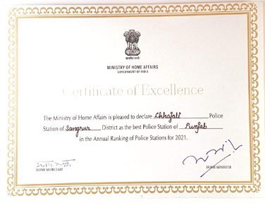 –ਦੇਸ਼ ਦੇ ਗ੍ਰਹਿ ਵਿਭਾਗ ਵੱਲੋਂ ਦਿੱਤਾ ਗਿਆ ਸਰਟੀਫਿਕੇਟ ਆੱਫ ਐਕਸੀਲੈਸਸ