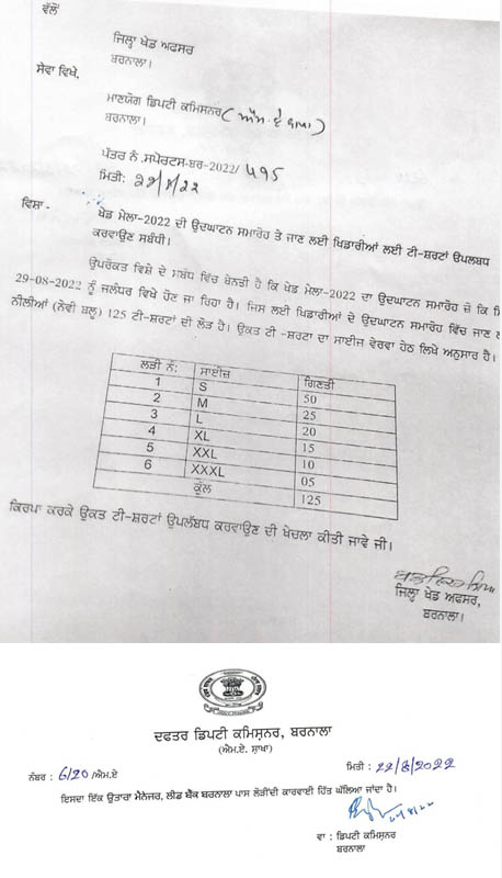 ਪੰਜਾਬ ਸਰਕਾਰ ਵੱਲੋਂ ਕਰਵਾਏ ਜਾ ਰਹੇ ਖੇਡ ਮੇਲੇ ਨੂੰ ਨੇਪਰੇ ਚਾੜ੍ਹਨ ਲਈ ਸਰਕਾਰੀ ਅਦਾਰਿਆਂ ਤੋਂ ਪੈਸੇ ਇਕੱਠੇ ਕਰਨ ਦਾ ਦਿਲਚਸਪ ਮਾਮਲਾ ਸਾਹਮਣੇ ਆਇਆ ਹੈ। ਉਂਜ ਤਾਂ ਭਾਵੇਂ ਹਰ ਪ੍ਰੈੱਸ ਕਾਨਫ਼ਰੰਸ ਵਿੱਚ ਖੇਡ ਮੰਤਰੀ ਇਹ ਦਾਅਵਾ ਕਰ ਰਹੇ ਹਨ ਕਿ ਸਰਕਾਰ ਕੋਲ ਖੇਡ ਮੇਲੇ ਲਈ ਫੰਡਾਂ ਦੀ ਕੋਈ ਘਾਟ ਨਹੀਂ ਪਰੰਤੂ ਸੱਚਾਈ ਇਹੋ ਹੈ ਕਿ ਖੇਡ ਮੇਲੇ ਵਿੱਚ ਭਾਗ ਲੈਣ ਵਾਲੇ ਖਿਡਾਰੀਆਂ ਨੂੰ ਟੀ-ਸ਼ਰਟਾਂ ਖਰੀਦ ਕੇ ਦੇਣ ਲਈ ਵੀ ਸਰਕਾਰ ਕੋਲ ਪੈਸੇ ਨਹੀਂ ਹਨ। ਬਰਨਾਲਾ ਦੇ ਜ਼ਿਲ੍ਹਾ ਖੇਡ ਅਫ਼ਸਰ ਵੱਲੋਂ ਡਿਪਟੀ ਕਮਿਸ਼ਨਰ ਨੂੰ ਲਿਖਿਆ ਇੱਕ ਪੱਤਰ ਇਸ ਸਚਾਈ ਨੂੰ ਹੂਬਹੂ ਬਿਆਨ ਕਰ ਰਿਹਾ ਹੈ ਕਿ ਸਰਕਾਰ ਨੇ ਜ਼ਿਲ੍ਹਾ ਪੱਧਰ ‘ਤੇ ਖੇਡ ਅਫਸਰਾਂ ਨੂੰ ਪੰਜਾਬ ਖੇਡ ਮੇਲੇ ਦੀਆਂ ਮੁੱਢਲੀਆਂ ਤਿਆਰੀਆਂ ਲਈ ਵੀ ਫੰਡ ਮੁਹੱਈਆ ਨਹੀਂ ਕਰਵਾਏ। ਦੱਸ ਦੇਈਏ ਕਿ ਪੰਜਾਬ ਖੇਡ ਮੇਲੇ ਦਾ ਉਦਘਾਟਨ 29 ਅਗਸਤ ਨੂੰ ਜਲੰਧਰ ਵਿਖੇ ਹੋ ਰਿਹਾ ਹੈ। ਇਸ ਉਦਘਾਟਨ ਸਮਾਗਮ ਵਿਚ ਬਰਨਾਲਾ ਜ਼ਿਲ੍ਹੇ ਤੋਂ ਸ਼ਾਮਲ ਹੋਣ ਵਾਲੇ ਖਿਡਾਰੀਆਂ ਲਈ ਜ਼ਿਲ੍ਹਾ ਖੇਡ ਅਫ਼ਸਰ ਨੇ ਡਿਪਟੀ ਕਮਿਸ਼ਨਰ ਤੋਂ 125 ਨੀਲੇ ਰੰਗ ਦੀਆਂ ਟੀ-ਸ਼ਰਟਾਂ ਦੀ ਮੰਗ ਕੀਤੀ ਹੈ। ਜ਼ਿਲ੍ਹਾ ਖੇਡ ਅਫਸਰ ਬਲਵਿੰਦਰ ਸਿੰਘ ਨੇ 22 ਅਗਸਤ ਨੂੰ ਡਿਪਟੀ ਕਮਿਸ਼ਨਰ ਨੂੰ ਲਿਖੇ ਇਕ ਪੱਤਰ ਵਿਚ ਮੰਗ ਕੀਤੀ ਹੈ ਕਿ ਜਲੰਧਰ ਵਿਖੇ ਪੰਜਾਬ ਖੇਡ ਮੇਲੇ ਦੇ ਉਦਘਾਟਨੀ ਸਮਾਗਮ ‘ਚ ਬਰਨਾਲਾ ਤੋਂ ਸ਼ਾਮਲ ਹੋਣ ਵਾਲੇ ਖਿਡਾਰੀਆਂ ਨੂੰ 125 ਟੀ- ਸ਼ਰਟਾਂ ਦਿੱਤੀਆਂ ਜਾਣ ਤਾਂ ਜੋ ਇਹ ਟੀ -ਸ਼ਰਟਾਂ ਪਾ ਕੇ ਖਿਡਾਰੀ ਉਦਘਾਟਨੀ ਸਮਾਗਮ ਵਿੱਚ ਸ਼ਾਮਲ ਹੋ ਸਕਣ।ਜ਼ਿਲ੍ਹਾ ਖੇਡ ਅਫ਼ਸਰ ਨੇ ਡਿਪਟੀ ਕਮਿਸ਼ਨਰ ਤੋਂ ਟੀ- ਸ਼ਰਟਾਂ ਦੇ ਛੋਟੇ ਸਾਈਜ਼ ਤੋਂ ਲੈ ਕੇ ਵੱਡੇ ਸਾਈਜ਼ ਤਕ 125 ਟੀ ਸ਼ਰਟਾਂ ਦੀ ਮੰਗ ਕੀਤੀ ਹੈ। ਡਿਪਟੀ ਕਮਿਸ਼ਨਰ ਨੇ 22 ਅਗਸਤ ਨੂੰ ਹੀ ਇਹ ਪੱਤਰ ਅੱਗੇ ਮੈਨੇਜਰ ਲੀਡ ਬੈਂਕ ਬਰਨਾਲਾ ਨੂੰ ਭੇਜ ਦਿੱਤਾ ਅਤੇ ਮੈਨੇਜਰ ਲੀਡ ਬੈਂਕ ਬਰਨਾਲਾ ਨੇ ਡਿਪਟੀ ਕਮਿਸ਼ਨਰ ਦੇ ਹੁਕਮਾਂ ਨੂੰ ਮੰਨਦੇ ਹੋਏ ਅੱਗੇ ਜ਼ਿਲ੍ਹੇ ਅੰਦਰ ਸਾਰੀਆਂ ਬੈਂਕਾਂ/ਬ੍ਰਾਂਚਾਂ ਨੂੰ ਪ੍ਰਤੀ ਬੈਂਕ 2000 ਰੁਪਏ ਖਿਡਾਰੀਆਂ ਨੂੰ ਟੀ-ਸ਼ਰਟਾਂ ਖਰੀਦ ਕੇ ਦੇਣ ਲਈ ਜਮ੍ਹਾਂ ਕਰਵਾਉਣ ਦੇ ਹੁਕਮ ਚਾੜ੍ਹ ਦਿੱਤੇ। ਮੈਨੇਜਰ ਲੀਡ ਬੈਂਕ ਬਰਨਾਲਾ ਵੱਲੋਂ ਜ਼ਿਲ੍ਹੇ ਦੀਆਂ ਬੈਂਕਾਂ/ਬਰਾਂਚਾਂ ਨੂੰ ਸਟੇਟ ਬੈਂਕ ਆਫ ਇੰਡੀਆ ਦੀ ਖੁੱਡੀ ਕਲਾਂ ਬ੍ਰਾਂਚ ਵਿਚ ਤੁਰੰਤ 2000 ਰੁਪਏ ਜਮ੍ਹਾ ਕਰਵਾਉਣ ਲਈ ਕਿਹਾ ਗਿਆ ਹੈ। ਹੁਣ ਸਵਾਲ ਇਹ ਉੱਠਦਾ ਹੈ ਕਿ ਜੇਕਰ ਸਰਕਾਰ ਖਿਡਾਰੀਆਂ ਨੂੰ ਟੀ ਸ਼ਰਟਾਂ ਦੇਣ ਲਈ ਹੀ ਬੈਂਕਾਂ ਤੋਂ ਦਾਨ ਦੇ ਰੂਪ ਵਿੱਚ ਪੈਸੇ ਮੰਗ ਰਹੀ ਹੈ ਤਾਂ ਇਹ ਗੱਲ ਕੰਧ ‘ਤੇ ਲਿਖੇ ਵਾਂਗ ਸਾਫ਼ ਹੈ ਕਿ ਖੇਡ ਮੇਲੇ ਦੀਆਂ ਵੱਡੀਆਂ ਤਿਆਰੀਆਂ ਲਈ ਫੰਡ ਕਿਵੇਂ ਜੁਟਾਏ ਗਏ ਹੋਣਗੇ। ਚਰਚਾ ਇਹ ਵੀ ਹੈ ਕਿ ਬਰਨਾਲਾ ਜ਼ਿਲ੍ਹੇ ਲਈ ਤਾਂ ਸਰਕਾਰ ਨੂੰ ਪੰਜਾਬ ਖੇਡ ਮੇਲੇ ਦੀਆਂ ਤਿਆਰੀਆਂ ਖ਼ਾਤਰ ਜ਼ਿਲ੍ਹਾ ਖੇਡ ਅਫ਼ਸਰ ਨੂੰ ਲੋੜੀਂਦੇ ਫੰਡ ਦੇਣੇ ਚਾਹੀਦੇ ਸਨ ਕਿਉਂਕਿ ਸਾਡਾ ਤਾਂ ਖੇਡ ਮੰਤਰੀ ਆਪਣਾ ਹੀ ਹੈ।ਇਕ ਪਾਸੇ ਤਾਂ ਅਸੀਂ ਖੇਡਾਂ ਵਿੱਚ ਹਰਿਆਣੇ ਦਾ ਮੁਕਾਬਲਾ ਕਰਨ ਦੀਆਂ ਗੱਲਾਂ ਕਰ ਰਹੇ ਹਾਂ ਪ੍ਰੰਤੂ ਦੂਜੇ ਪਾਸੇ ਸਾਡੇ ਕੋਲ ਖਿਡਾਰੀਆਂ ਨੂੰ ਵਰਦੀਆਂ ਦੇਣ ਲਈ ਵੀ ਪੈਸੇ ਨਹੀਂ ਹਨ। ਕਮਾਲ ਦੀ ਗੱਲ ਹੈ ਕਿ ਖੇਡ ਮੇਲੇ ਲਈ ਪੈਸੇ ਮੁਲਾਜ਼ਮਾਂ ਤੋਂ ਇਕੱਠੇ ਕੀਤੇ ਜਾ ਰਹੇ ਹਨ ਅਤੇ ਮਸ਼ਹੂਰੀ ਸਰਕਾਰ ਆਪਣੀ ਕਰੀ ਜਾ ਰਹੀ ਹੈ। ਇਹ ਤਾਂ ਉਹ ਗੱਲ ਹੋਈ ਅਖੇ “ਗੱਲੀਂਬਾਤੀ ਮੈਂ ਵੱਡੀ.. ਕੰਮੀ ਵੱਡੀ ਦਰਾਣੀ..!