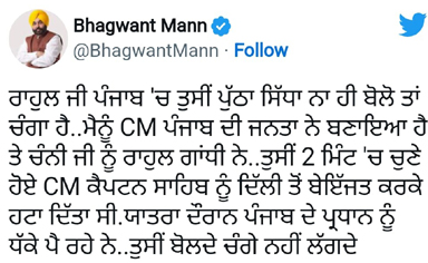ਚੰਡੀਗੜ੍ਹ-ਭਾਰਤ ਜੋੜੋ ਯਾਤਰਾ ਦੌਰਾਨ ਸ੍ਰੀ ਰਾਹੁਲ ਗਾਂਧੀ ਵੱਲੋਂ ਪੰਜਾਬ ਦੇ ਮੁੱਖ ਮੰਤਰੀ ਭਗਵੰਤ ਮਾਨ ਸਬੰਧ ਟਿੱਪਣੀ ਦਾ ਭਗਵੰਤ ਮਾਨ ਨੇ ਕਰਾਰਾ ਜਵਾਬ ਦਿੱਤਾ ਹੈ । ਮੁੱਖ ਮੰਤਰੀ ਮਾਨ ਨੇ ਰਾਹੁਲ ਗਾਂਧੀ ਨੂੰ ਟਵੀਟ ਕਰਕੇ ਕਿਹਾ ਹੈ ਕਿ “ਰਾਹੁਲ ਜੀ ! ਤੁਸੀਂ ਪੰਜਾਬ ਵਿਚ ਪੁੱਠਾ ਸਿੱਧਾ ਨਾ ਹੀ ਬੋਲੋ ਤਾਂ ਚੰਗਾ ਹੈ.. ਮੈਨੂੰ ਮੁੱਖ ਮੰਤਰੀ ਪੰਜਾਬ ਦੀ ਜਨਤਾ ਨੇ ਬਣਾਇਆ ਹੈ ਅਤੇ ਚੰਨੀ ਨੂੰ ਰਾਹੁਲ ਗਾਂਧੀ ਨੇ ਬਣਾਇਆ ਸੀ”। ਆਪਣਾ ਟਵੀਟ ਜਾਰੀ ਰੱਖਦੇ ਹੋਏ ਭਗਵੰਤ ਮਾਨ ਨੇ ਅੱਗੇ ਲਿਖਿਆ ਕਿ “ਤੁਸੀਂ ਸੀਐੱਮ ਕੈਪਟਨ ਸਾਹਬ ਨੂੰ ਦੋ ਮਿੰਟ ਵਿੱਚ ਦਿੱਲੀ ਤੋਂ ਹਟਾ ਦਿੱਤਾ ਸੀ… ਯਾਤਰਾ ਦੌਰਾਨ ਪੰਜਾਬ ਦੇ ਪ੍ਰਧਾਨ ਨੂੰ ਧੱਕੇ ਪੈ ਰਹੇ ਨੇ… ਤੁਸੀਂ ਬੋਲਦੇ ਹੋ ਚੰਗੇ ਨਹੀਂ ਲੱਗਦੇ” । ਦੱਸਣਯੋਗ ਹੈ ਕਿ ਸ੍ਰੀ ਰਾਹੁਲ ਗਾਂਧੀ ਨੇ ਪੰਜਾਬ ਦੀ ਰਾਜਨੀਤੀ ਬਾਰੇ ਟਿੱਪਣੀ ਕਰਦੇ ਹੋਏ ਭਗਵੰਤ ਮਾਨ ਨੂੰ ਸਲਾਹ ਦਿੱਤੀ ਸੀ ਕਿ ਭਗਵੰਤ ਮਾਨ ਨੂੰ ਕੇਜਰੀਵਾਲ ਦਾ ਰਿਮੋਟ ਕੰਟਰੋਲ ਨਹੀਂ ਬਣਨਾ ਚਾਹੀਦਾ। ਰਾਹੁਲ ਗਾਂਧੀ ਦੀ ਟਿੱਪਣੀ ਦਾ ਜਵਾਬ ਵੀ ਭਗਵੰਤ ਮਾਨ ਨੇ ਉਸੇ ਭਾਸ਼ਾ ਵਿੱਚ ਦਿੱਤਾ ਹੈ ।