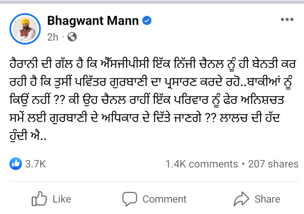 ਚੰਡੀਗੜ੍ਹ, 21 ਜੁਲਾਈ-ਸ਼੍ਰੋਮਣੀ ਗੁਰਦੁਆਰਾ ਪ੍ਰਬੰਧਕ ਕਮੇਟੀ ਵਲੋਂ ਸ੍ਰੀ ਦਰਬਾਰ ਸਾਹਿਬ ਤੋਂ ਗੁਰਬਾਣੀ ਪ੍ਰਸਾਰਣ ਦੇ ਅਧਿਕਾਰ 24 ਜੁਲਾਈ ਤੋਂ ਫੇਰ PTC ਚੈਨਲ ਨੂੰ ਦਿੱਤੇ ਜਾਣ ‘ਤੇ ਮੁੱਖ ਮੰਤਰੀ ਭਗਵੰਤ ਮਾਨ ਨੇ ਤਿੱਖੀ ਟਿੱਪਣੀ ਕੀਤੀ ਹੈ । ਇੱਕ ਟਵੀਟ ਦੇ ਜ਼ਰੀਏ ਮੁੱਖ ਮੰਤਰੀ ਨੇ ਕਿਹਾ, ‘ਹੈਰਾਨੀ ਦੀ ਗੱਲ ਹੈ ਕਿ ਐੱਸਜੀਪੀਸੀ ਇੱਕ ਨਿੱਜੀ ਚੈਨਲ ਨੂੰ ਹੀ ਬੇਨਤੀ ਕਰ ਰਹੀ ਹੈ ਕਿ ਤੁਸੀਂ ਪਵਿੱਤਰ ਗੁਰਬਾਣੀ ਦਾ ਪ੍ਰਸਾਰਣ ਕਰਦੇ ਰਹੋ। ਬਾਕੀਆਂ ਨੂੰ ਕਿਉਂ ਨਹੀਂ ?? ਕੀ ਉਹ ਚੈਨਲ ਰਾਹੀਂ ਇੱਕ ਪਰਿਵਾਰ ਨੂੰ ਫੇਰ ਅਨਿਸ਼ਚਤ ਸਮੇਂ ਲਈ ਗੁਰਬਾਣੀ ਦੇ ਅਧਿਕਾਰ ਦੇ ਦਿੱਤੇ ਜਾਣਗੇ ?? ਲਾਲਚ ਦੀ ਹੱਦ ਹੁੰਦੀ ਐਂ…!